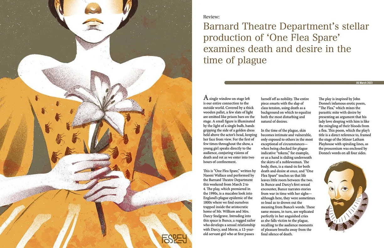 Sawoski, Catherine. (2023, March 6). Review: Barnard Theatre Department’s stellar production of “one flea spare” examines death and desire in the time of plague. Columbia Daily Spectator.